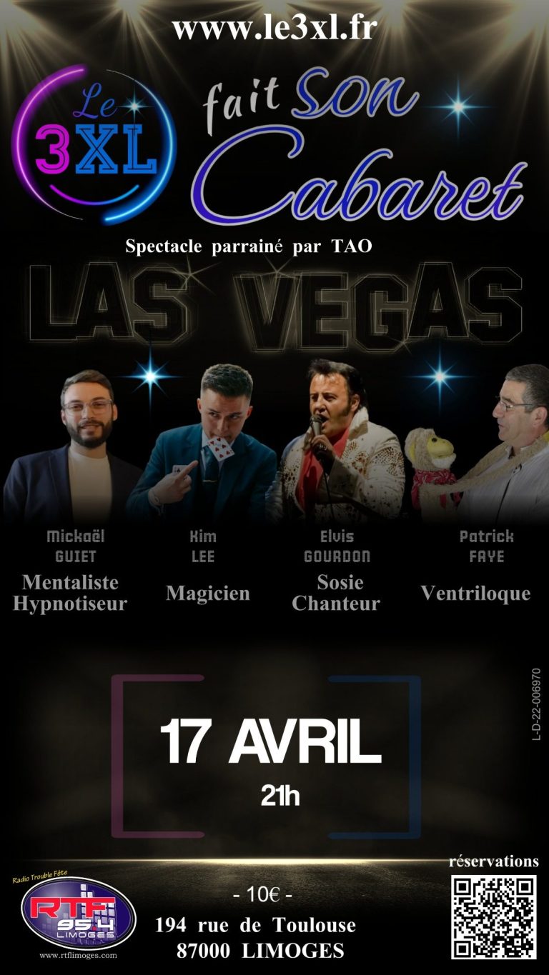 Las Vegas au 3XL, c'est ce qu'on vous propose de venir découvrir avec nos 4 artistes pour un show unique. Au programme de cette soirée, magie (Kim LEE), mentalisme / hypnose (Mickaël GUIET), ventriloquie (Patrick FAYE) et sosie d'Elvis (Francis GOURDON), plus de 2H de spectacle rythmé plein d'énergie, d'humour et d'émotion.